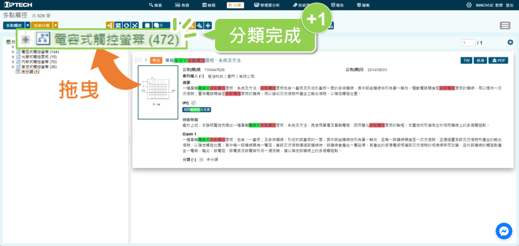 分類完成,綠標再現,當你在做專利分類時,只要拖曳專利,綠標將會點亮你的每一步。不必再疑惑到底分類了沒,只需一眼,綠標就會告訴你,你的專利是否找到了家。