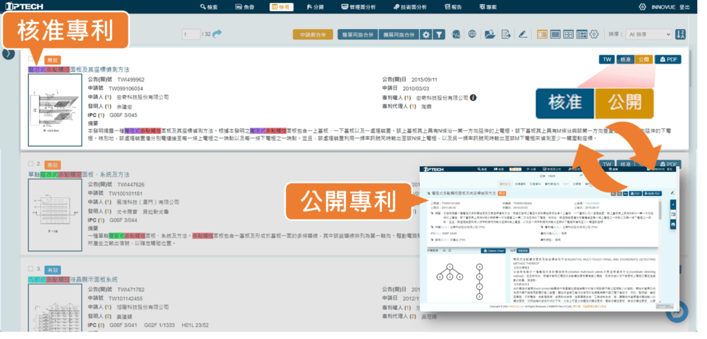 如果檢索一篇專利,並儲存成專案,不論你存專案時有沒有剃除重複,點進專案裡的列表中,依然可以在列表右上角顯示核准及公開,讓您快速切換,輕鬆穿梭在專利之間。