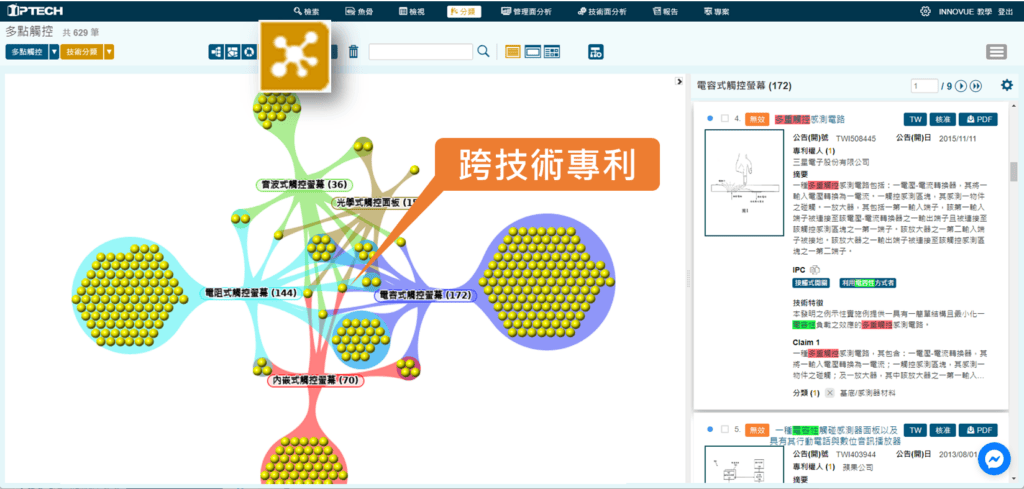 點選分類,再點一下這個ICON,專利集群分析圖表,IPTECH把跨技術專利圖像化,不僅可以知道分類中被重覆分類的跨技術專利,還可以快速瀏覽其中的專利,迅速辨識專利之間的關聯性喔!
