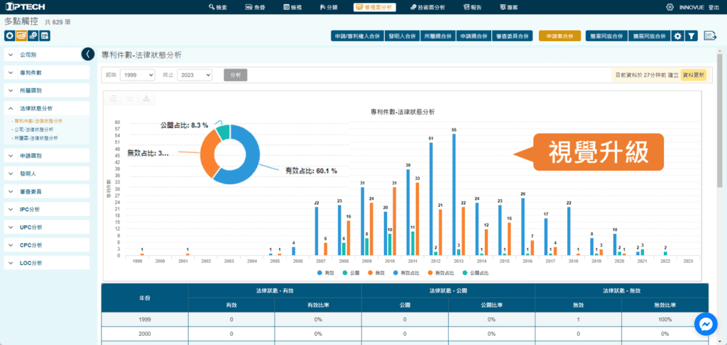 進入管理或技術面分析,找到法律狀態分析,我們這次將法律狀態的圖表大改造啦,把圓餅圖和直條圖完美區隔,IPTECH的圖表不僅僅是數據的展示,更是我們對美感與細節的堅持,也同時反映著客戶的期望喔!