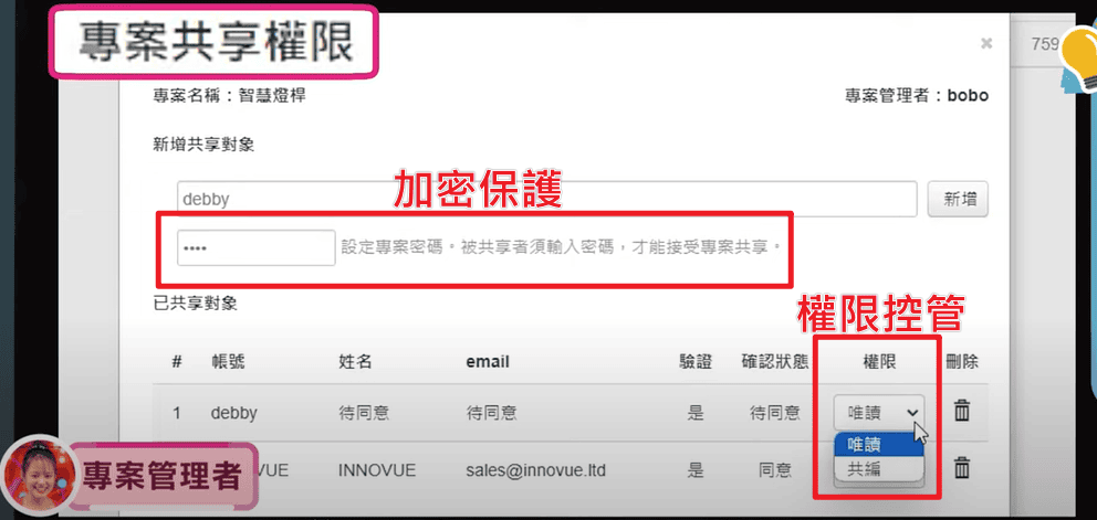 新增後,這裡還有「權限」可以選擇喔!專案管理者可以選擇共享對象的專案使用權限,我們這裡有「唯讀」跟「共編」!