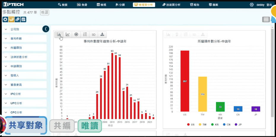 在唯讀權限下,有保留系統分類、蜂窩圖、旭日圖及關聯圖可以使用。其實管理面分析、技術面分析所有圖表都能查看並選擇模式,甚至還可以匯出圖表嘛!其實唯讀者在分析上可以用的功能全都有!美美的圖表都還在,還可以用,而且還是可以自訂年份啦、還有專利權人去做不同角度的分析,很夠用了啦~