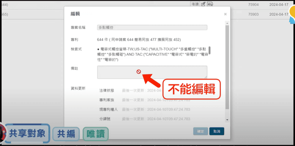那最後,再介紹一下,不管你是唯讀者、還是共編者,你都「不能」使用的功能,像是專案備份、編輯檢索式,例如編輯名稱及備註,還有包含更新專利資料,像是法律狀態、專利家族等。這些功能,這是只有「專案管理者」「本人」,才可以用的喔!