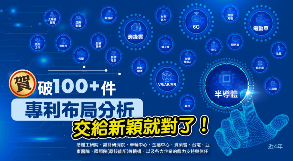 現在跟政府申請資助的創新研究發展計劃超過3000萬以上,就要進行智財布局分析報告,報告內容就包刮有:製作團隊概況、分析標的說明、檢索策略與過程、智財分析、智財布局策略等等,我們也是這幾年跟著各大研究機構或是企業廠商的需求,進行各式領域的專利分析與布局報告,其中也非常謝謝各位朋友對新穎公司的支持,讓我們有這麼多的機會更深入的與您合作。
