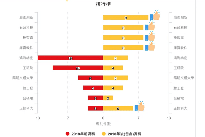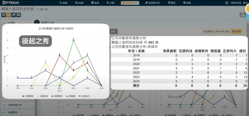 當然,別忘記,這張圖也可以看出「後起之秀」像海柔創新、極致嘉等的專利情報,這些在專利分析上是不是非常有價值的情報呢!