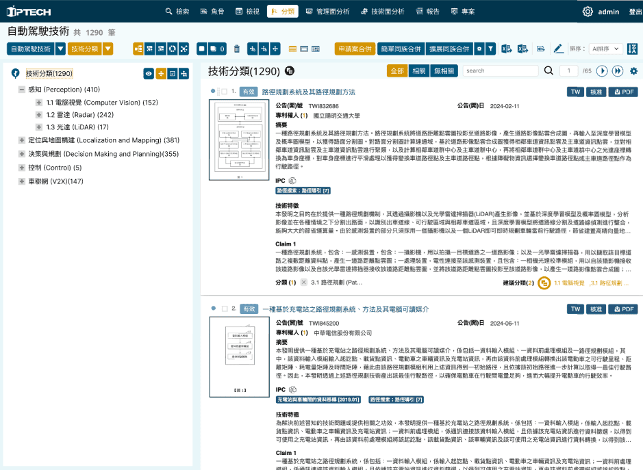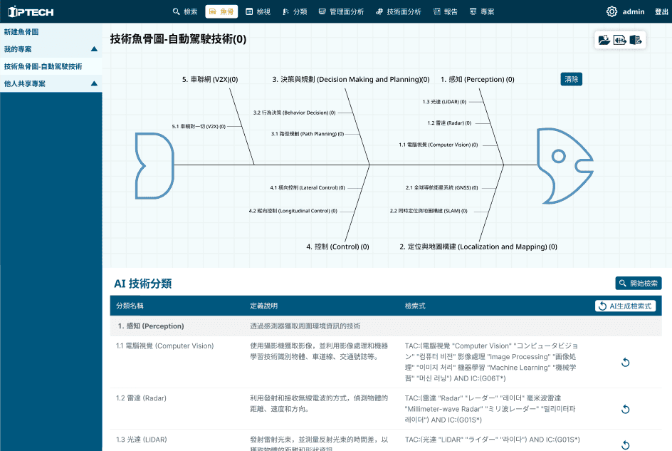 在IPTECH系統的上方功能列,提供使用者可依功能逐步進行專利檢索分析的流程,我們剛剛從魚骨出發完成了專利檢索,那接下來是「分類」,這裏會自動產出剛建好的技術魚骨分類樹,進行篩選判讀,使用者可以自行刪除無關專利,或者依據分類結果,重新指派專利到新的技術節點下。像這樣拖曳專利到新的節點下,這些都是現在既有的功能哦!