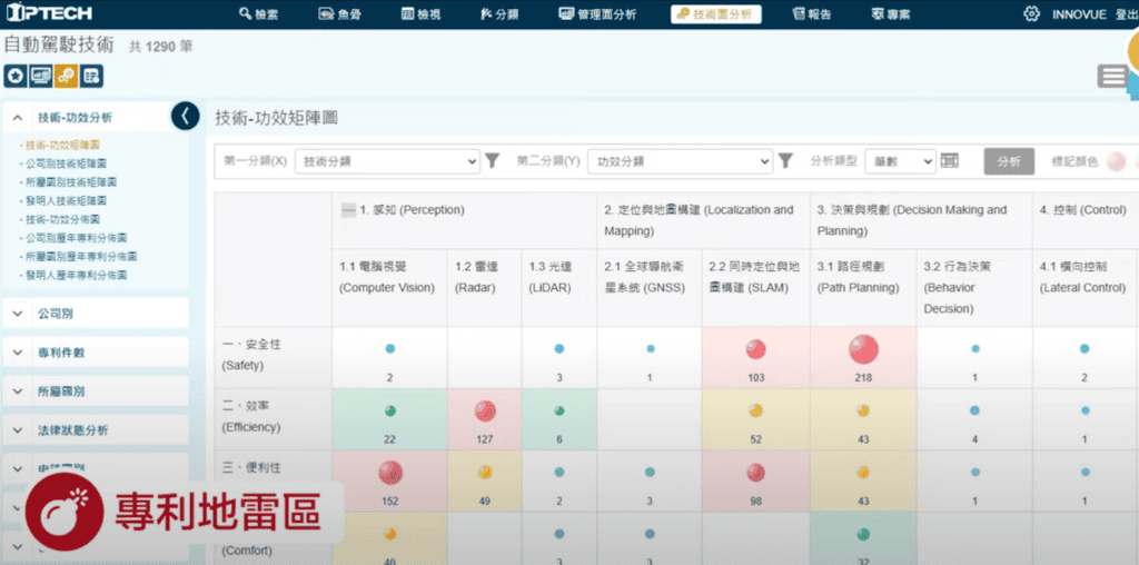 要一口氣看多階,才有機會看出全貌。這個在市面上的專利檢索系統,就比較少見了,透過技術功效矩陣地圖,您可以將分類技術逐一階層展開,就可以從整體,查看專利布局的「地雷區」、「新興區」或是「處女地帶」系統上還可以用顏色標示,方便彰顯分析結果。:這是現在IPTECH就有的功能吧!真的非常適合研發人員或是相關的專利分析人員的工作環境ㄟ,因為產出相關的情報分析就在點選之間啊!