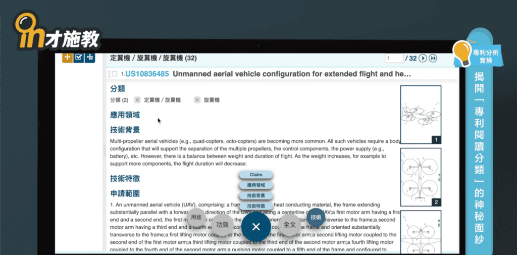 像這筆關於無人機專利,我在進行技術分類時,我們就可以將技術分類指定為「螺旋槳」的形狀結構設計,將專利拖曳到節點上,再放開,這樣分類裡有「形狀結構設計」。