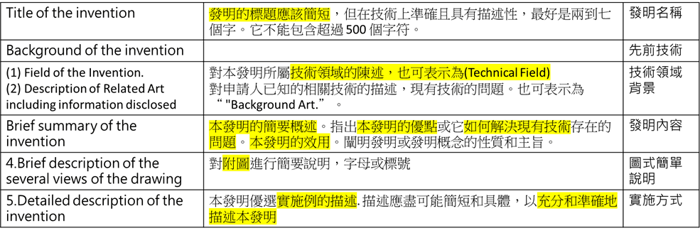 美國可以參考「Manual of Patent Examining Procedure」專利審查程序手冊MPEP中,在Chapter 600-Parts, Form, and Content of Application,有特別訂定專利說明書的審查規範,要求如下圖: