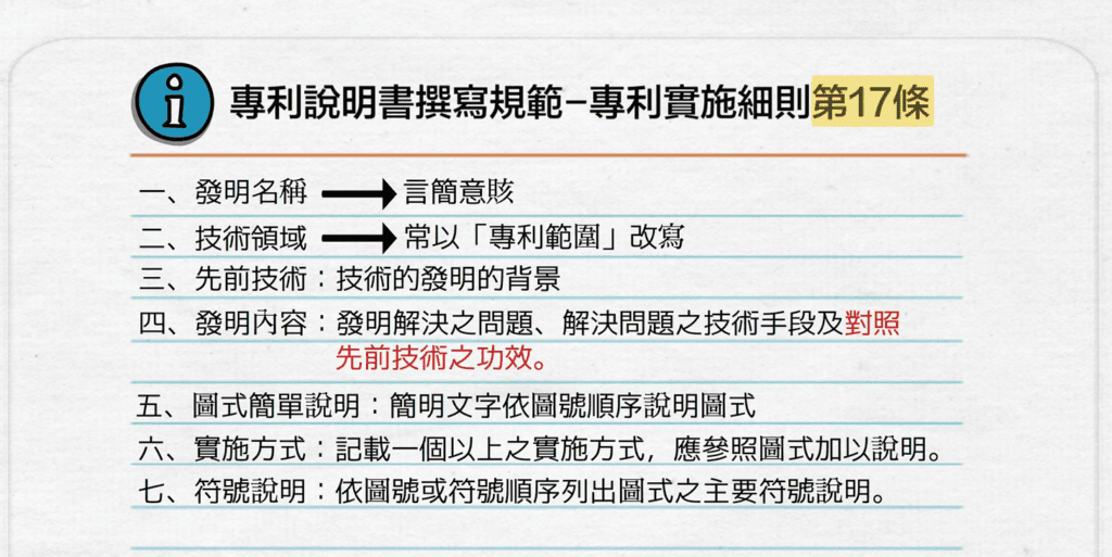 我國的「專利說明書的撰寫規範」可參考專利實施細則第十七條: