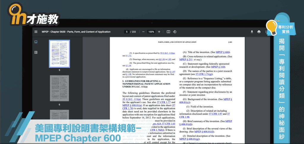 所以大致上都會有差不多的章節架構。因此,在全球最具經濟性的國家,進行專利檢索、分析,可以找到最先進的技術,所以通常會建議可以查詢美國專利。