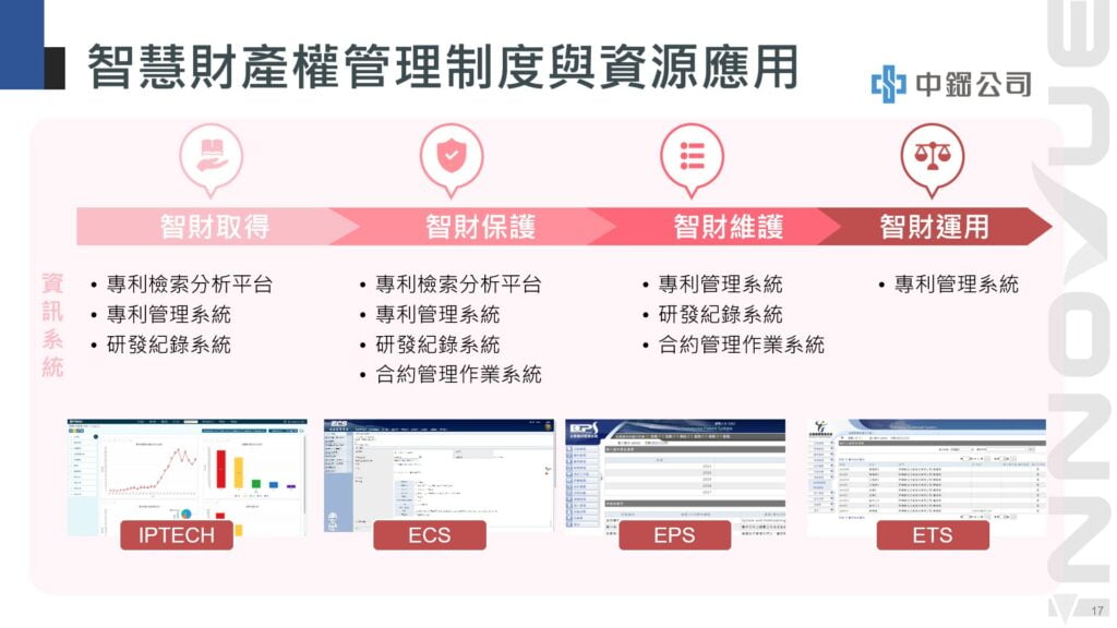 中鋼也會使用一些資訊系統去輔助它們的智財取得、保護、維護及運用流程。