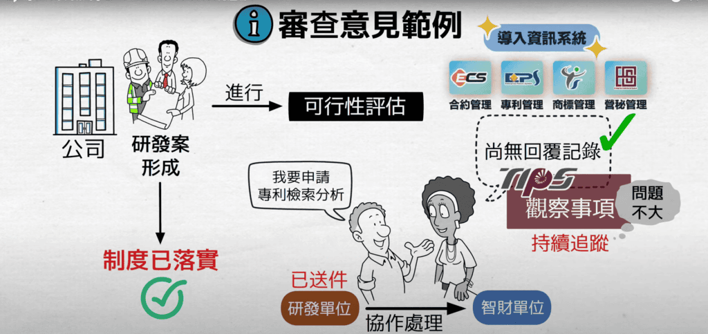 舉個例子分享,可能公司已經有確定一個研發案的形成了,他就要進行研發前的可行性評估,所以研發單位就會跟智財單位去提出,我需要專利檢索分析的申請的部分,這個單位的前案檢索跟分析,他請智財單位去協助處理,所以剛好這個案子有制度了已經落實,研發單位也已經送件申請專利檢索與分析了,可是智財單位可能還沒有回覆的記錄,所以就會落入所謂的觀察事項,因為要持續追蹤說智財單位的回覆記錄,這部分其實是問題不大的,因為這個就是我們公司的制度實施嘛,尚沒有回覆記錄而已,但是如果您有資訊系統來去進行做管控,其實這個記錄進度也許是可以證明的。