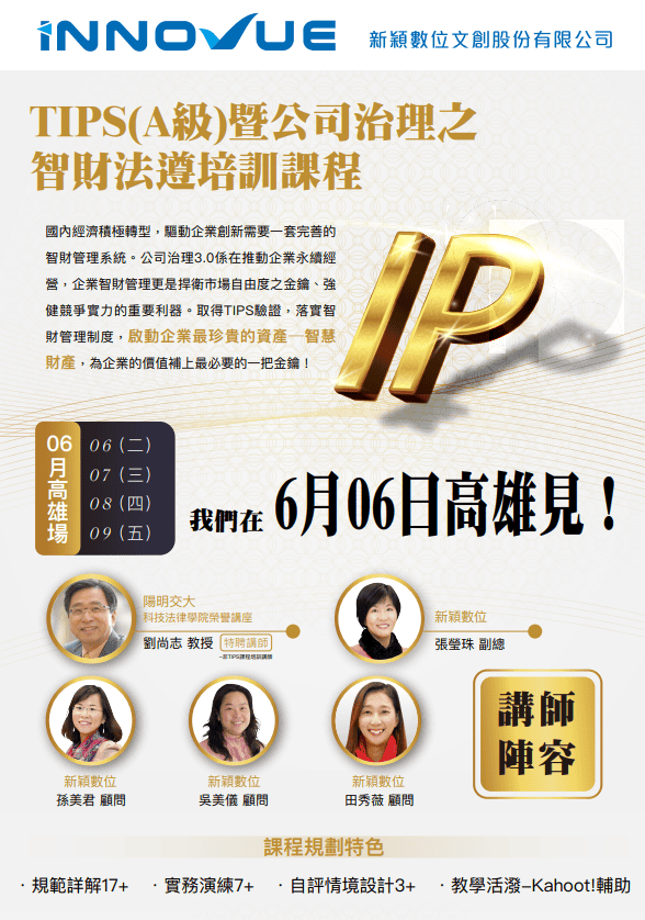 新穎今年一共舉辦3場TIPS暨公司治理之智財法遵培訓課程,第一場3/20在新竹、第二場4/19在台北、第三場6/6-6/9就在我們最熱情的南台灣高雄舉辦,如果有準備要申請TIPS驗證的廠商,可以一起來參加我們的TIPS自評員培訓課程哦!