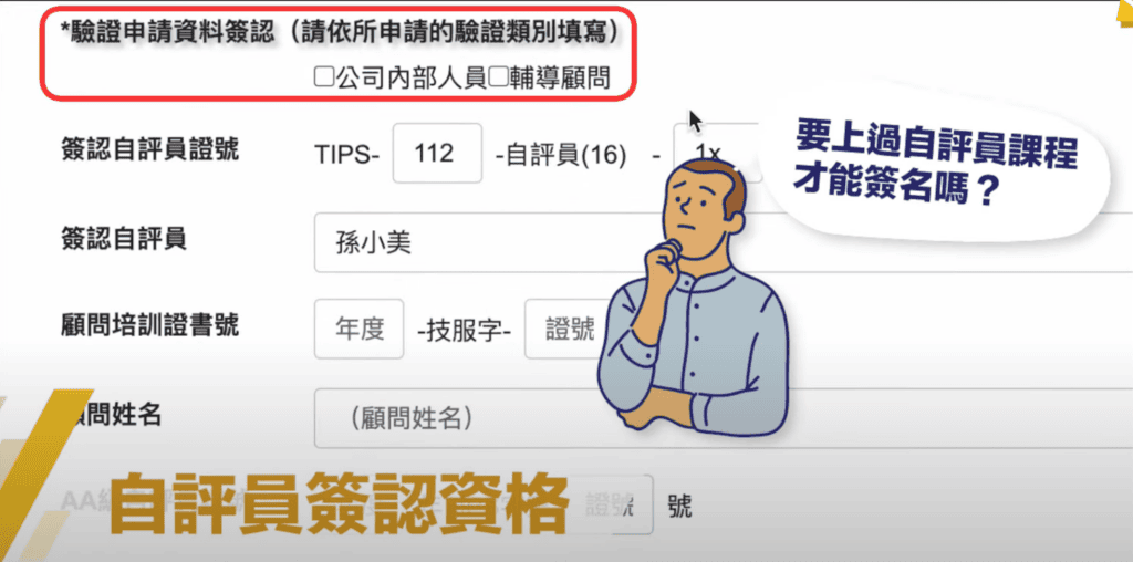 企業送案申請TIPS驗證,自評員的簽名一定要上過培訓課程的學員。