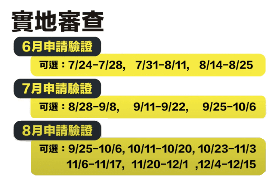 通常「稽核作業」至少要規劃2-3周,接下來就要進行「矯正措施的改善作業」至少要2-3周,最後才能提報「管審會議」。這樣推估一下期程,如果企業現在還沒有進行制度公告,後續還要進行稽核作業階段,這樣在8月底提案申請驗證,就會非常趕了。
