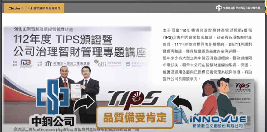中鋼是我們輔導的公司哦!大家相處的都非常的愉快,中鋼的智財報告書也是許多培訓單位會拿來當作課程講述的範例,中鋼的TIPS輔導品質也是備受同業肯定的!
