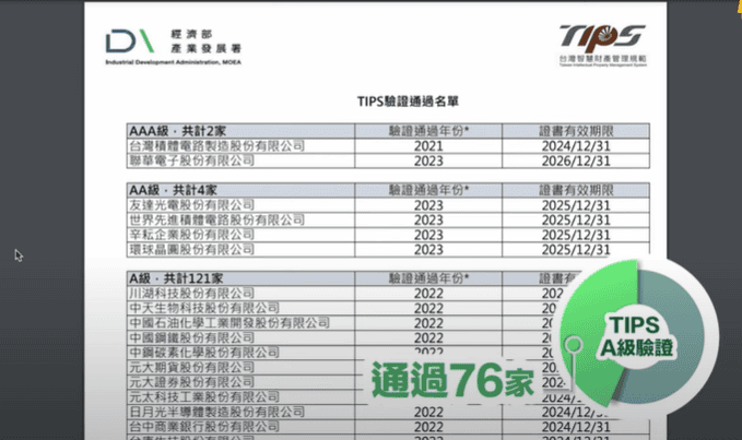 在TIPS網頁已經有公告,在2023年驗證通過的廠商A級有76家;AA級有4家;AAA有1家。今年大概有160家申請驗證,不到5成通過率啊!