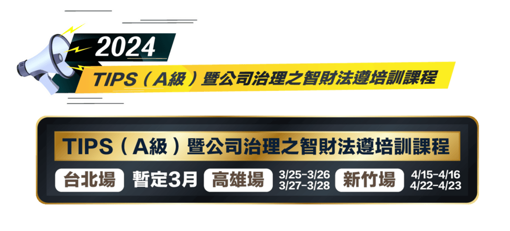 這麼精彩的「TIPS(A級)暨公司治理之智財法遵培訓課程」期待您的參加,我們在培訓課程見面!