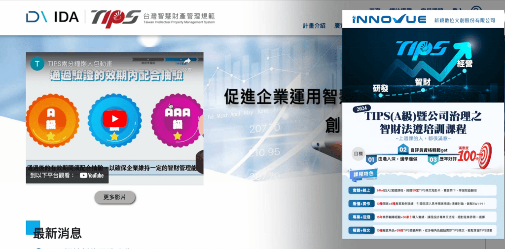 最新的快訊,關於2024年「TIPS(A級)暨公司治理之智財法遵培訓課程」,也就是參加完這個課程的陪訓以後並且通過考試,參與的學員就可以拿到「TIPS自評員」資格了。這是要申請TIPS驗證最基本的準備工作哦!而新穎公司也是TIPS自評員的培訓單位。