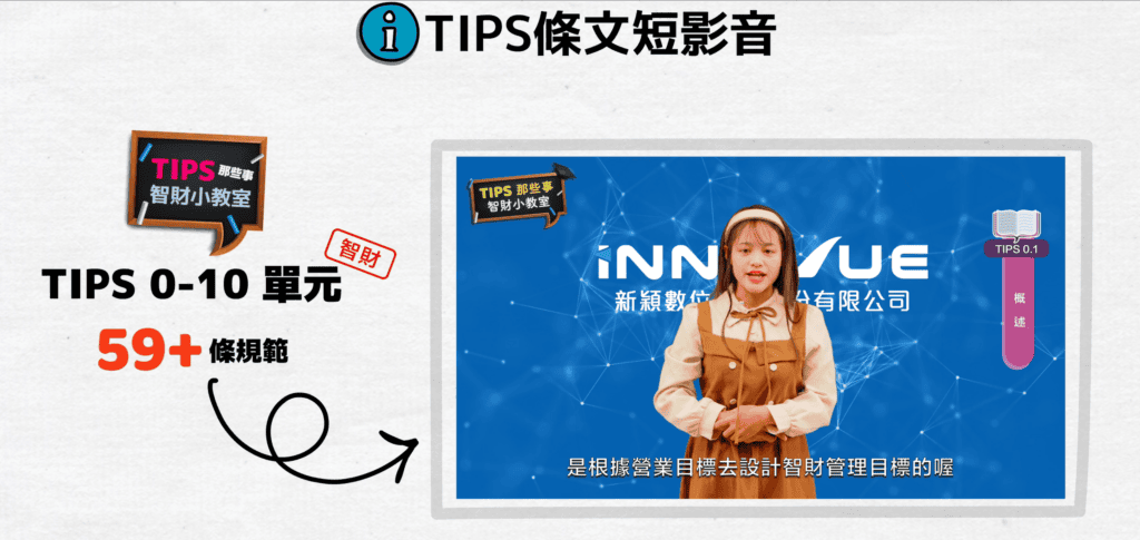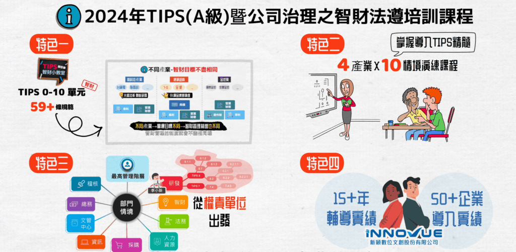 最新快訊!新穎公司2024年「TIPS(A級)暨公司治理之智財法遵培訓課程」開放報名囉!我們再升級TIPS條文學習體驗,豐富活潑的課程特色,讓您輕鬆掌握TIPS精髓,上完課後可以驕傲的說:「我有TIPS自評員資格!」