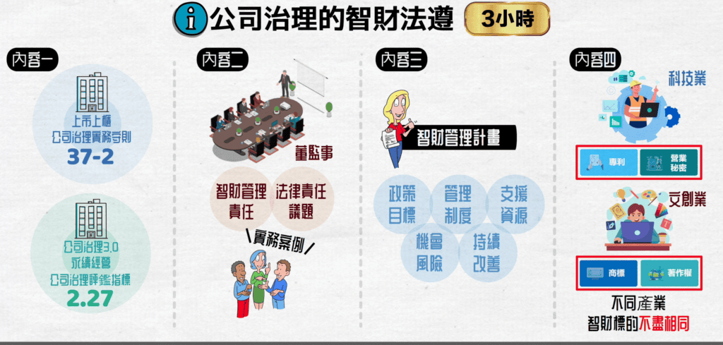 實體課程規劃的授課期間只有24小時,所以我們要再把握課間時間,您計算看看哦,這個課程我們勢必會對於公司治理之智財法遵進行授課,讓您更了解公司治理中規範的智財議題,包括有: