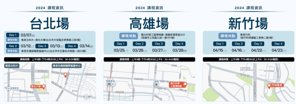 台北場:在3/7在集思北科大、3/12、3/13、3/14在集思交通部國際會議中心。
