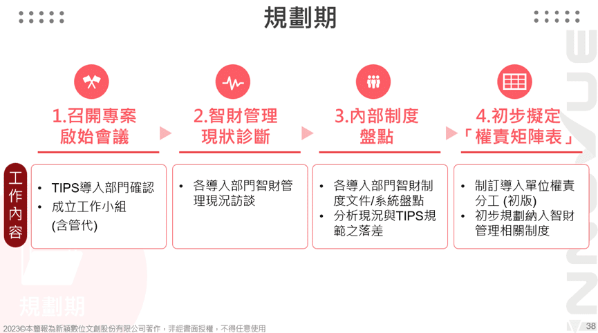 今天先讓大家有個初步的概念,不管你的導入標的是專利、商標、營業秘密、還是著作權。在你第一年導入TIPS時,主要分為四個階段喔!