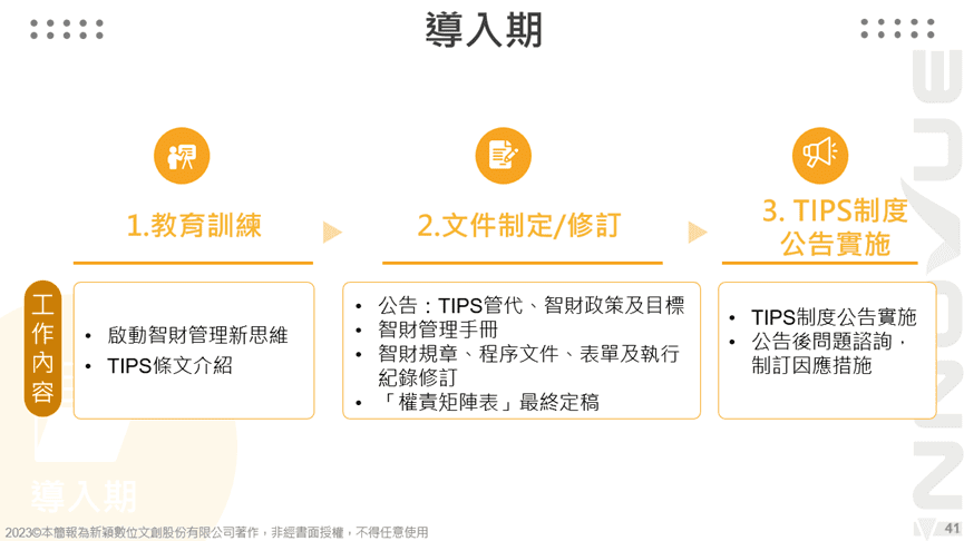 「導入期」主要有三個步驟,分別是「教育訓練」、「文件制定與修訂」以及「TIPS制度公告實施」。