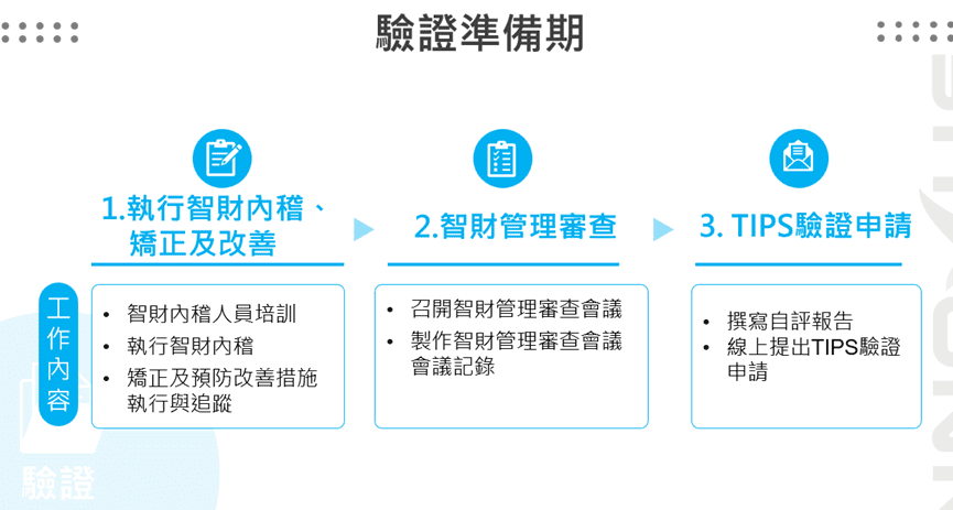 那下一個階段,就是「驗證準備期」,有三個步驟喔!分別是「執行智財內稽、矯正及改善」、「智財管理審查」、以及「TIPS驗證申請」。
