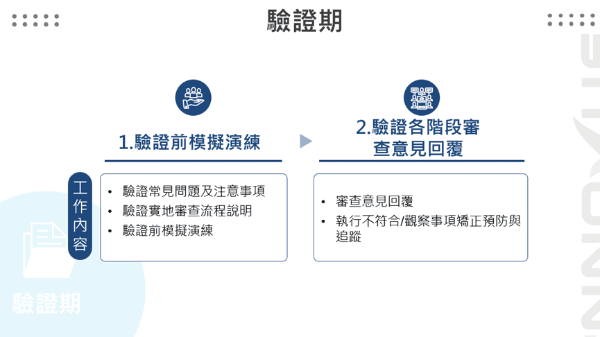 最後一個階段,「驗證期」,也就是要開始做外部驗證囉!在「驗證期」的步驟分別是「驗證前模擬演練」、以及「驗證各階段審查意見回覆」。