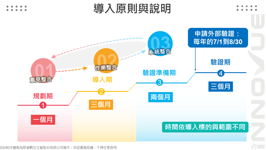 分別是「規劃期」也就是要先做意見整合,時程大概一個月、然後是「導入期」也就是要作業整合,大概三個月,再來就是「驗證準備期」就是要做系統整合啦,也要兩個月左右。最後就是「驗證期」,一般都是每年的7月1號到8月30號可以申請外部驗證,然後差不多年底就會驗證完成,也是要花三個月左右囉。但整個導入的花費時間,還是要看組織導入標的跟導入範圍,而有所不同,總之大家要提早開始準備!
