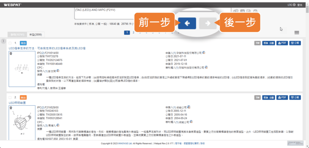 「前一步」、「後一步」恢復您各步驟的檢索歷程結果,無須重新檢索。檢索歷程優化設計,讓WEBPAT更符合您的期待!