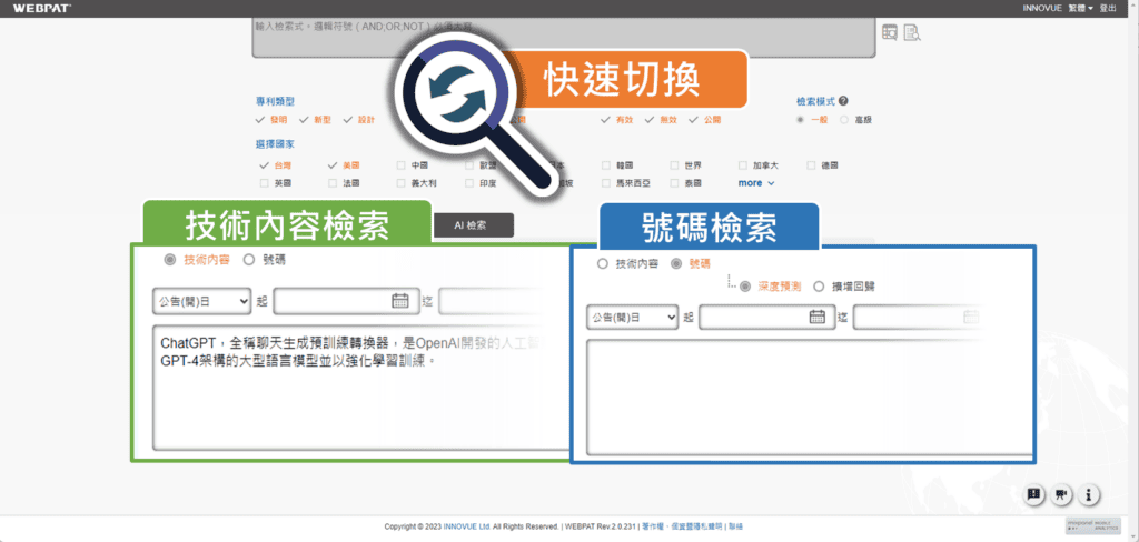 AI檢索任您挑,雙重方法全力助您!「技術內容檢索」與「號碼檢索」,簡單快速切換,IPTECH操作體驗更一步到位!