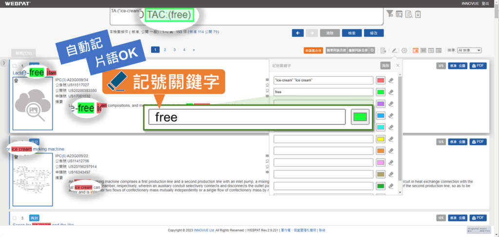 你的貼心記號小助理就在身邊,讓閱讀專利更得心應手!「再檢索」時自動增加記號關鍵字,通通Highlight起來啦,連片語也ok喔!