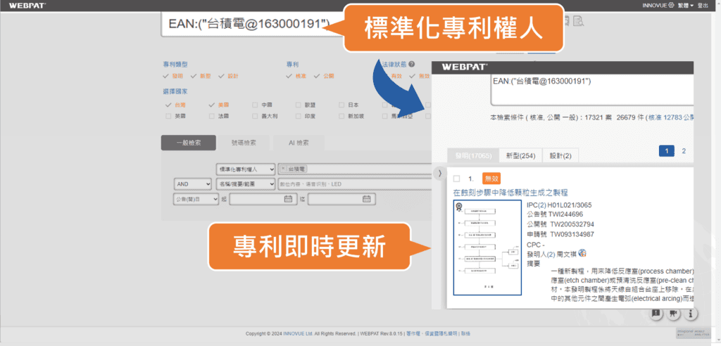 標準化專利權人整併優化,只要專利權人有新的專利資料,便會即時抓取,速更新!確保你能隨時獲取最完整的專利資訊。